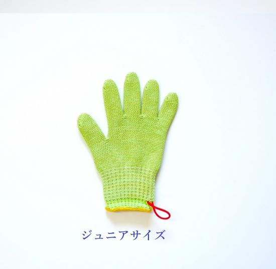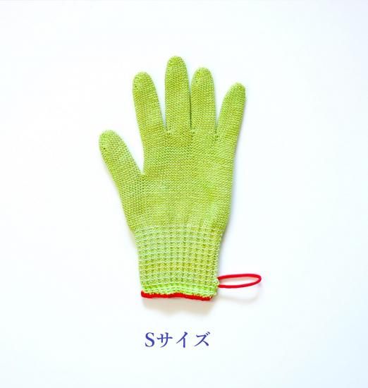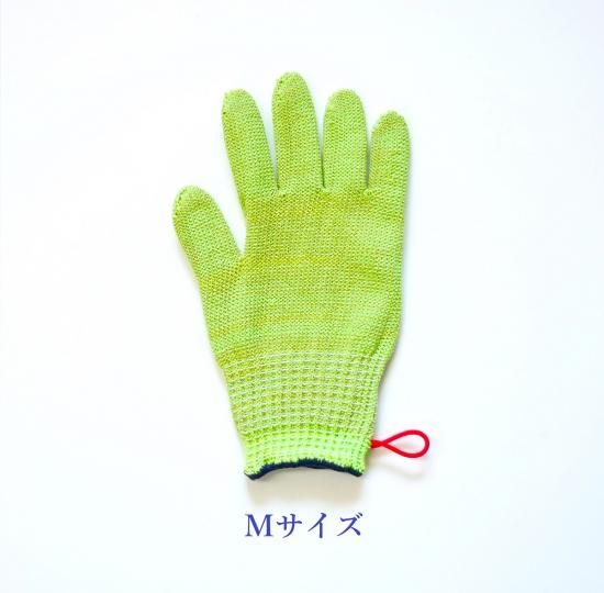 ・ステンレス入りの糸で編んだ耐切創性に優れた手袋。包丁の刃や魚のザラザラから手を守る。